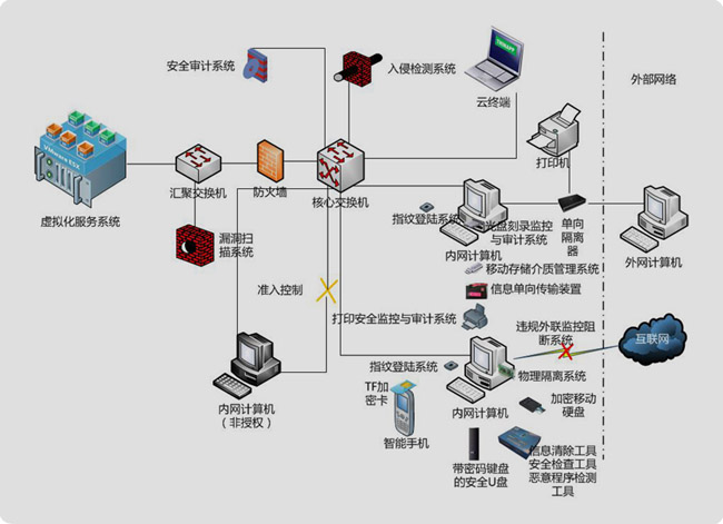 該解決方案利用涉密計算機及移動存儲介質保密管理系統的違規外聯管理控制、移動存儲介質使用管理控制和非涉密信息單向導入等功能,實現內部計算機非法連接互聯的實時阻斷,同時上報主管保密部門;實現計算機USB接口等外設端口的控制,確保用戶合理使用計算機外部端口設備;實現非涉密信息通過單向導入裝置輸入涉密計算機,涉密信息通過專用安全U盤和單向導入裝置的專用接口的安全信息交換。